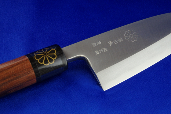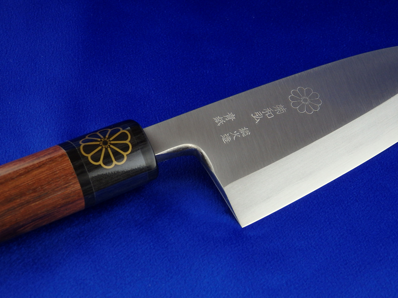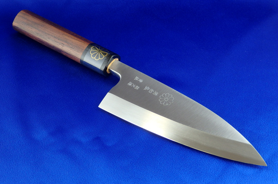 [KikuKazuhiro's] Deba Knife <Sou-hizukuri Method> Japan's highest quality of steel,Yasugi speciality steel Aogami, is used. The steel and mild steel are combined by hand-forging. Manufacturing method All by hand-forging (Souhi-zukuri Method) Stuff Yasugi Specialty Steel "Aogami" Handle Rosewood Appointment To Tokyo traditional crafts Manufacturer KikuKazuhiro (by Takayuki Okawara) Package box Japanese Paulownia box Length of blade Approximate 140mm These products are not allowed to return Out of stock